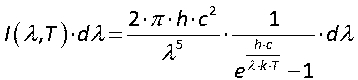- Bereits 1900 hatte Max Planck bei der Beschreibung der spektralen Verteilung der Wärmestrahlung für den idealen Schwarzen Körper ein Gesetz aufgrund seiner damals revolutionären Postulierung quantisierter Energien für Oszillatoren gefunden, das die gesamte spektrale Verteilung der Wärmestrahlung erstmals vollständig und richtig wiedergab und damit die beiden bis dahin nur in Teilen richtigen Strahlungsgesetze von Rayleigh-Jeans (näherungsweise richtig für große Wellenlängen) und Wien (näherungsweise richtig für kleine Wellenlängen) ersetzte. Es beschreibt die Strahlungsintensität in einem Wellenlängenintervall in Abhängigkeit von der (absoluten) Temperatur T und der Wellenlänge λ: