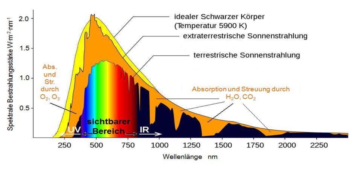 - Das Strahlungsspektrum unserer Sonne ist zunächst einmal das Strahlungsspektrum eines sog. Schwarzen Körpers mit der Temperatur von ca. 5900 K, also derjenigen Temperatur, wie sie an der Oberfläche der Sonne herrscht. Bereits in der Atmosphäre der Sonne werden aber manche Spektralbereiche (teilweise) absorbiert (IBE Fraunhoferlinien), bevor das Licht nach ca. 150.000.000 km auf die Atmosphäre der Erde gelangt, bei deren Durchgang dann wiederum verschiedene Stoffe zu einer weiteren spektral verteilten (teilweisen) Absorption beitragen (O3, H2O, CO2 etc. mit den Stichwörtern Ozonloch, Klimaerwärmung...), bevor das Licht zuletzt uns auf der Erdoberfläche erreicht.
