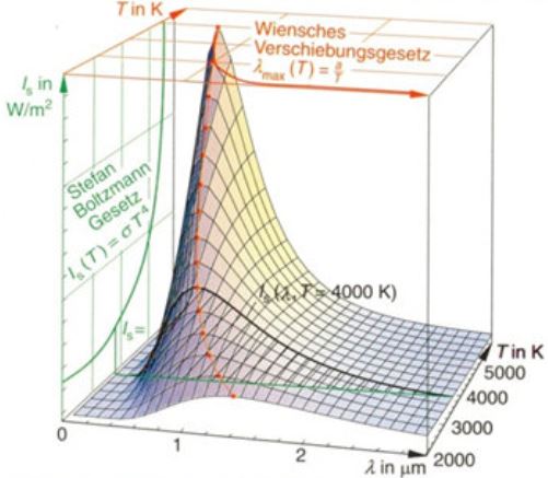 - Eine 3D-Grafik der funktionalen Abhängigkeit der Intensität der Strahlung in Abhängigkeit von Temperatur und Wellenlänge zeigt folgende Abbildung:
