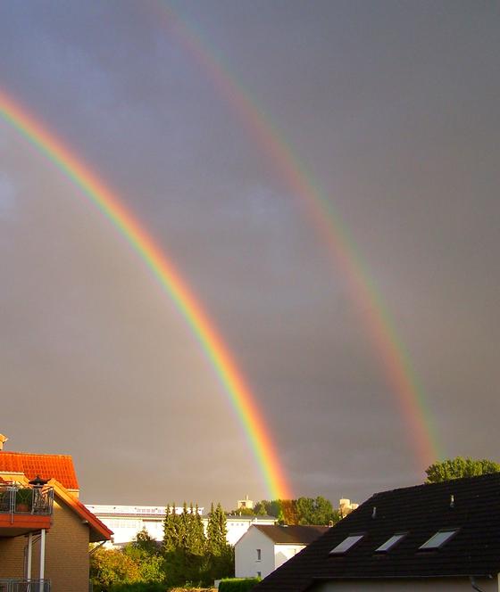 - Informieren Sie sich über die Entstehung des Regenbogens bzw. der beiden Regenbögen im Internet, z. B. hier oder hier. Sie sollten dann folgende Fragen beantworten können: