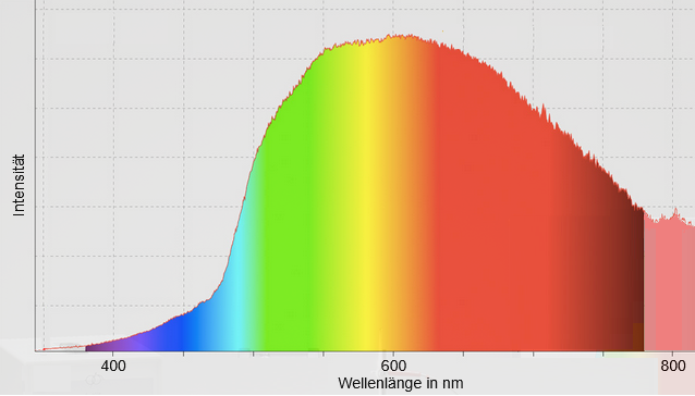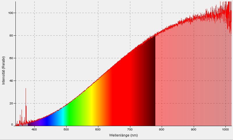 Die Ursache für die vorgenannten Widersprüche ist darin begründet, dass das verwendete Spektrometer eine in Abhängigkeit von der Wellenlänge des registrierten Lichts sehr unterschiedliche Empfindlichkeit besitzt, was man bei der Erzeugung des wahren Glühlampenspektrums berücksichtigen muss. Mit den vom Hersteller des Spektrometers für diese Zwecke gelieferten Korrekturangaben ergibt sich für das wahre Glühlampenspektrum die nachfolgende Gestalt, die erahnen lässt, dass eine Glühlampe, anders als aus dem Diagramm des o. g. IBE ersichtlich, nur einen sehr kleinen Bruchteil ihrer abgestrahlen Energie in Form von sichtbarem Licht abgibt - der bei weitem überwiegende Teil ist Wärmestrahlung.