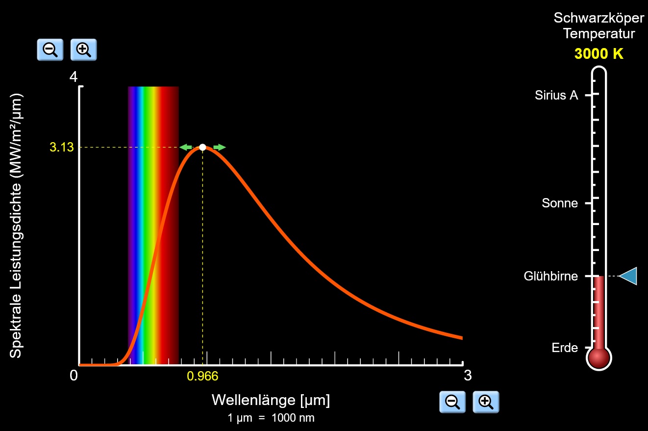 Mit dem IBE auf dieser Seite können Sie sich die von einem Spektrometer registrierte Strahlung einer Glühlampe bei unterschiedlicher Helligkeit anzeigen lassen. Das jeweilige Spektrum wird dargestellt, wie es sich bei der unmittelbaren Aufzeichnung mittels eines Spektrometers ergibt. Erläutern Sie, inwiefern sich hier Widersprüche mit dem entsprechenden Spektrum aus dem soeben verwendeten Applet ergeben.