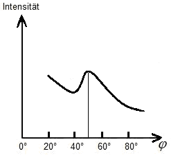 Die nebenstehende Abbildung zeigt ein (skizziertes) Messergebnis, das die Intensitätsverteilung bei fester Beschleunigungsspannung und variablem Winkel zeigt.