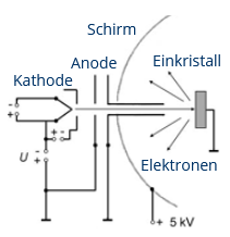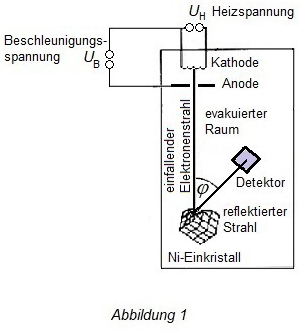Aus einer mit der Spannung UH geheizten Glühkathode treten Elektronen aus, die durch eine variable Beschleunigungsspannung UB in Richtung der Anode beschleunigt werden. Hinter der Anode treffen die Elektronen senkrecht auf die Oberfläche eines Nickeleinkristalls, der neben anderen den hier relevanten Abstand der schräg verlaufenden Netzebenen von d=91 pm hat (siehe Abbildung 2). Mit einem Detektor wird unter dem variablen Winkel φ die Intensität des Anteils der Elektronen gemessen, der in dieser Richtung registriert wird.