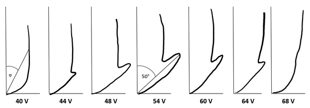 - Interpretieren Sie die Kurven der rechten Diagrammhälfte, die Davisson und Germer für Beschleunigungsspannungen der Elektronen von Urechts = 40 V bis Urechts = 68 V gemessen haben.