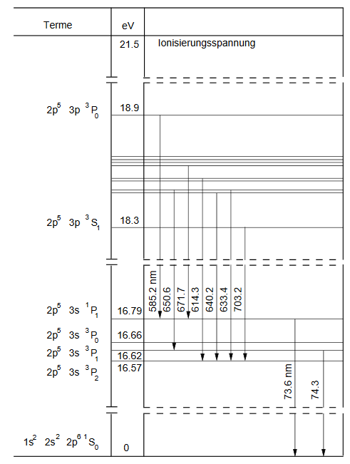 Nebenstehend finden Sie eine Abbildung des Energie- niveauschemas für die hier stattfindenden Prozesse: Bei der Anregung findet mit einer hohen Wahrscheinlichkeit ein Übergang vom 2s-Grundzustand in einen der zehn 3p-Zustände, die zwischen 18,3 eV und 18,9 eV entfernt liegen, statt. Die vier darunter liegenden 3s-Zustände zwischen 16,6 eV und 16,8 eV werden mit einer geringeren Wahrscheinlichkeit angeregt. Beim Rücksprung aus den 3p-Zuständen ist jedoch ein direkter Übergang in den 2s-Grundzustand nicht erlaubt, er kann nur über den Zwischenzustand im 3s-Niveau stattfinden.