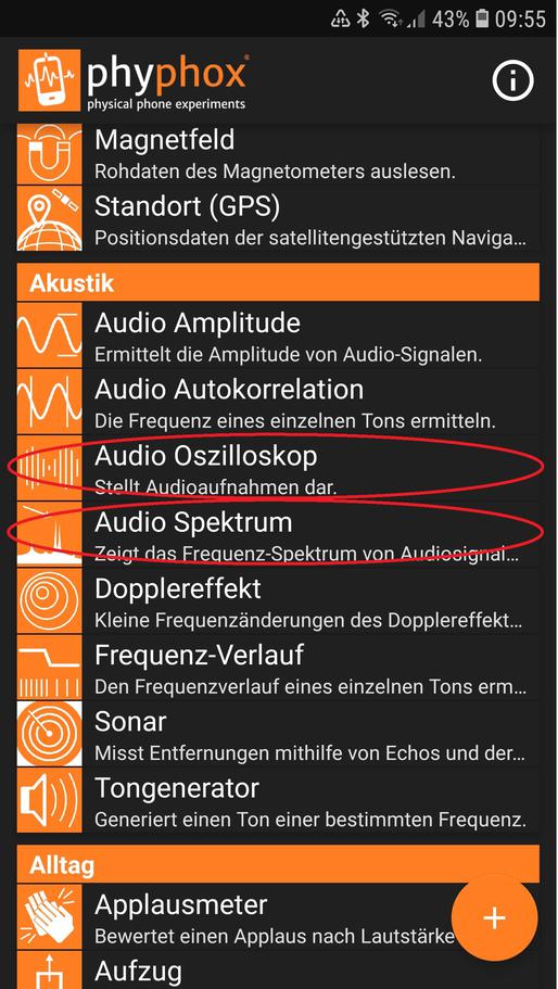 Lassen Sie sich beispielsweise mit Hilfe der in Phyphox integrierten App "Audio Oszilloskop" (2021) das zeitliche Verhalten von Klängen möglichst mehrerer Musikintrumente, insbesondere aber diejenigen eines Klaviers, Ihrer Stimme (Singen) oder anderer Geräusche, in Echtzeit anzeigen.