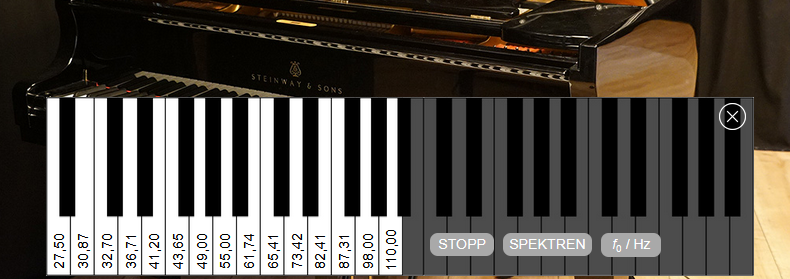 Im IBE können die Frequenzen der Grundtöne zu den weißen Tasten eingeblendet werden. So beträgt die Frequenz der Taste mit der Notation ,,A (Bezeichnung für die Taste am linken Rand) $f(,,A)=27,50Hz$, diejenige für die Taste ,A eine Oktave darüber genau das Doppelte, also $f(,A)=55,00Hz$. Entsprechend ergibt sich für die Taste am rechten Rand der im IBE bespielbaren Tastatur $f(A)=110,00Hz$.