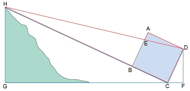Al-Biruni benutzte für die Höhenbestimmung ein Quadrat mit einer Seitenlänge $AD$ von ca. $a=0,5m$. Das Quadrat wurde mit seinem Eckpunkt $C$ auf den Boden gestellt und dort so fixiert, dass die Verlängerung der unteren Kante $CB$ genau in einer Linie mit dem Gipfel des Berges lag. Von der oberen Ecke $D$ aus peilte er über ein drehbares Lineal ebenfalls den Berggipfel an, so dass die Verbindungslinie die Seite des Quadrats im Punkt $E$ schnitt, womit die Länge der Strecke $AE$ bestimmt werden konnte. Ebenfalls vom Punkt $D$ aus ermittelte er den Punkt $F$ genau senkrecht unter der Quadratecke (etwa mit Hilfe eines Lots oder eines fallenden Steinchens) und bestimmte die Strecke $CF$.