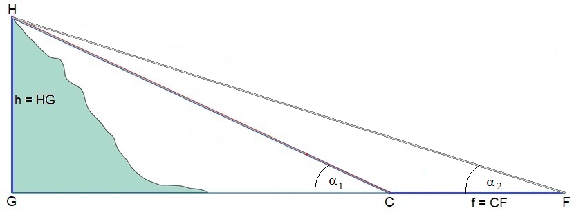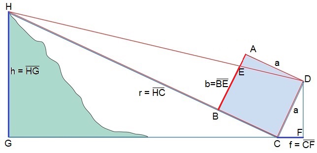 Leiten Sie eine Gleichung her zur Berechnung der Berghöhe $h$, wobei die Längen der Strecken $b=BE$ und $f=CF$ als bekannt angenommen werden dürfen.