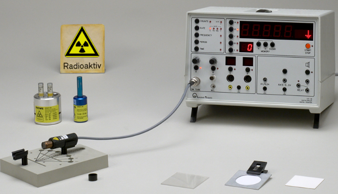 Das Aussehen von verschiedenen Geiger-Müller-Zählrohren kann sich etwas unterscheiden. Im Foto rechts sehen Sie das Geiger-Müller-Zählrohr, welches bei den IBE in diesem Kapitel verwendet wurde. Das Geiger-Müller-Zählrohr wird an einen Zähler angeschlossen, der häufig auch einen Lautsprecher besitzt, aus dem das typische "Knacken" bei der Registrierung eines Zerfalls zu hören ist.
