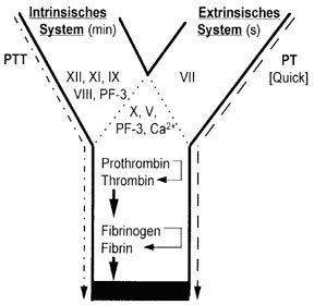Man unterscheidet zwischen dem intrinsischen (endogenen) und dem extrinsischen (exogen, von Tissue-factor abhängig) Gerinnungsweg, die i.d.R. gleichzeitig ablaufen bzw. sich gegenseitig aktivieren.